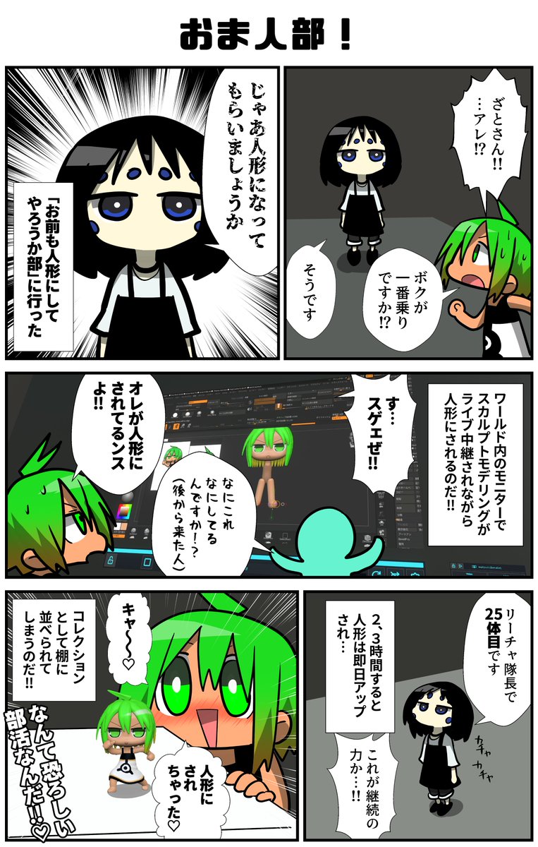 ぶいちゃの森の奥深く…一見、何の変哲もない綺麗なワールド。だが…その一角では…時々…不定期…VRChatterの歓喜にも似た叫び声が聞こえるとか…聞こえないとか…「お前も人形にしてやろうか!!」 最高!!ありがとうございました!! #VRC漫画 #VRChat #VRCお前も人形にしてやろうか部