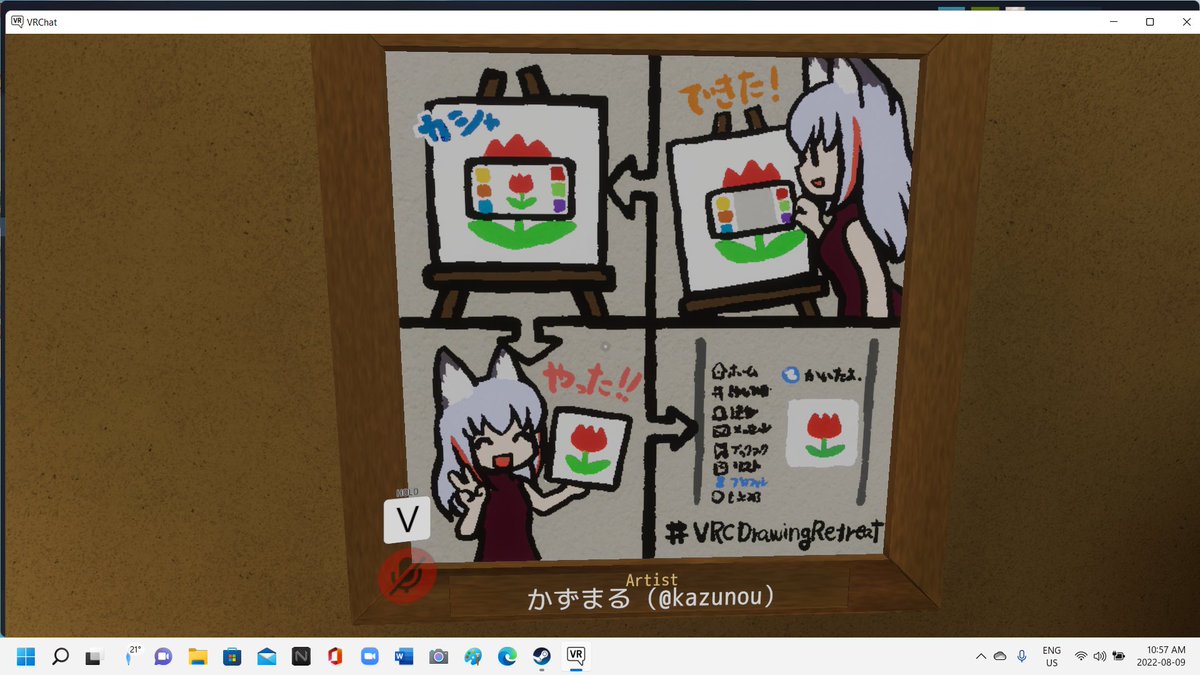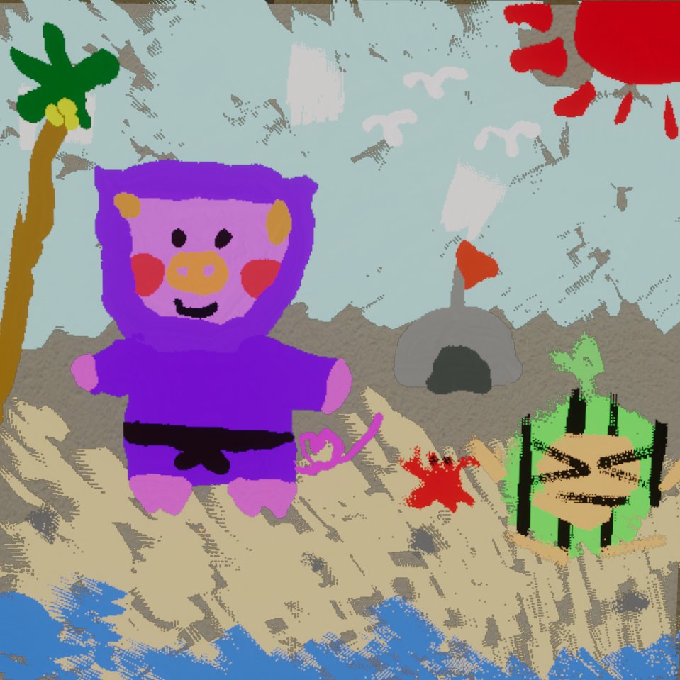 #おまゆうワールド巡礼 でおまゆうちゃんも訪れたお絵描きのワールドにてイラスト描きました。参加人数に対してキャンバスが足りなかったので(笑) 自分とふぇるりーす @Itati_feru さんで一緒に描きました! テーマ「砂浜で楽しむぶた丸とスイカ人間」#VRCDrawingRetreat #おま絵