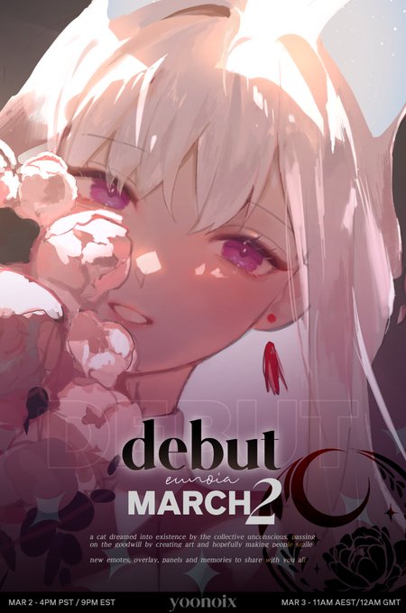 ✨🌸 D E B U T ! 🌸✨ 🌸MAR 2 FOR 4PM PST AND 7PM EST! 🌸MAR 3 FOR 11AM AEST, 4PM GMT AND 9AM JST! I hope to see you there! #Vtuber #ENvtuber #Vtuberdebut