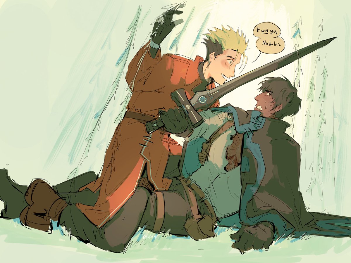 #vashwoodweek day 2 “names” Que bonitos ojos tiene compadre 💫 Latino Nicholas speaking Spanish to Vash makes my heart burn. WOLFWOOD IS MEXICAN AND NO ONE CAN TELL ME OTHERWISE #vashwood #trigun #trigunstampede #vashthestampede #nicholaswolfwood