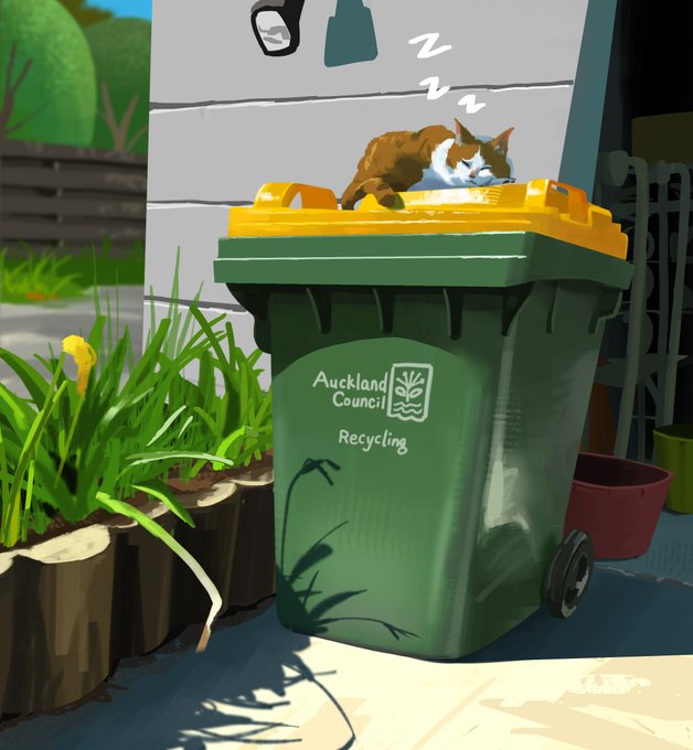 When it's sunny and warm, I often spot a cat sleeping on top my recycling bin. #art #visdev #visualdevelopment #illustraion