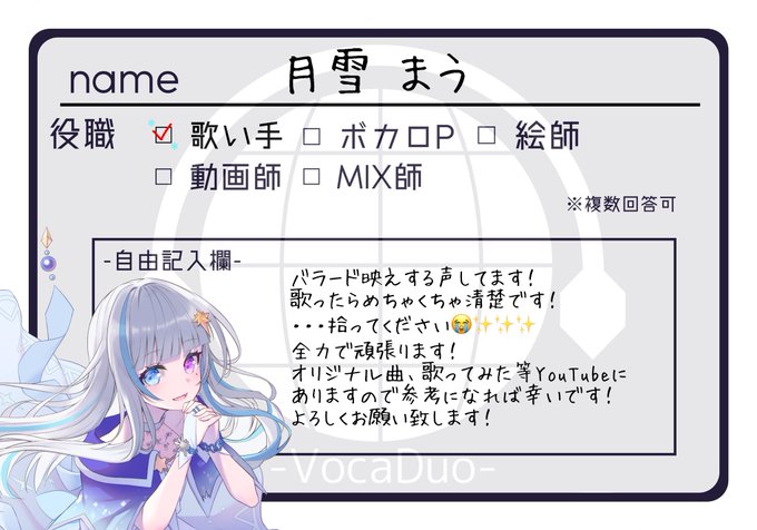 今年は色々なことに挑戦したい・・・ ので勇気をだして動きます! Vsingerの月雪まうです! 一緒に素敵な1歩を踏み出しませんかっ🐾? 拾ってください!! よろしくお願い致します! youtube.com/playlist?list=… #ボカデュオ #VocaDuo #歌い手さんMIX師さん動画師さん絵師さんPさんと繋がりたい