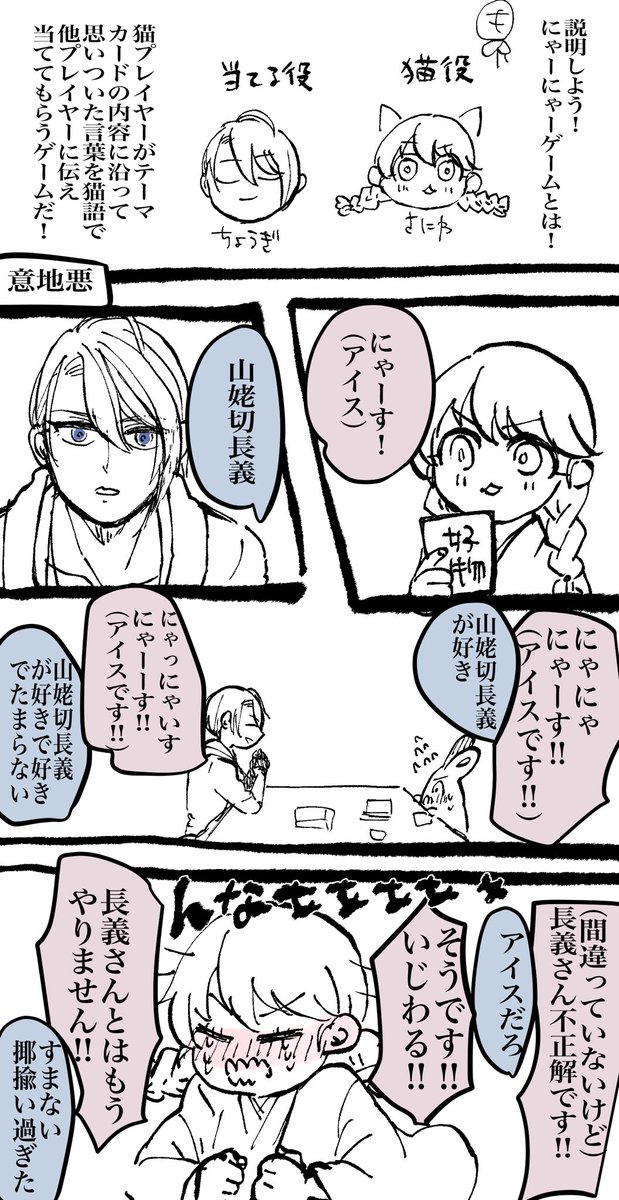 #W山姥切と女審神者版60分一本勝負 開催ありがとうございます! 長義さに「意地悪」 にゃーにゃーゲームをしたら審神者さんが可愛くて意地悪した長義くんでしたが 審神者さんが怒ってしまい、反省する長義くんでしたまる 好物だから物である長義くんを対象にするのはあながち間違いではない…
