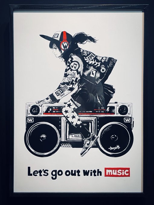 明日よりジンマ(@Gsecond_9mm )主催の企画展開催!音楽をテーマに新作描かせてもらいました。1枚だけの展示販売と併せて同作品のステッカーを50枚販売用に作らせてもらいましたので関西圏の皆様ぜひ✌︎ kinone.gallery/event/ex220302… #wanted #大阪