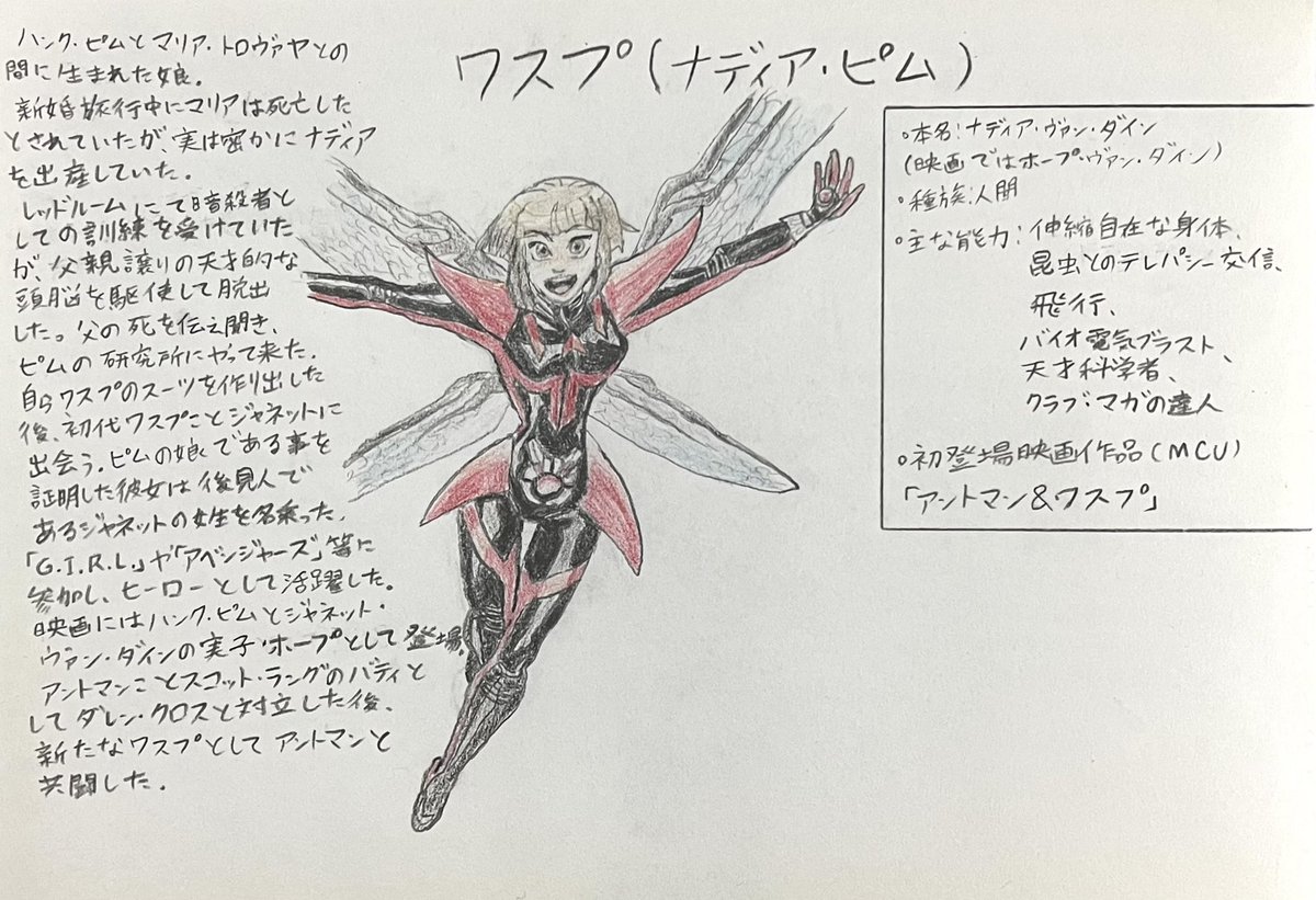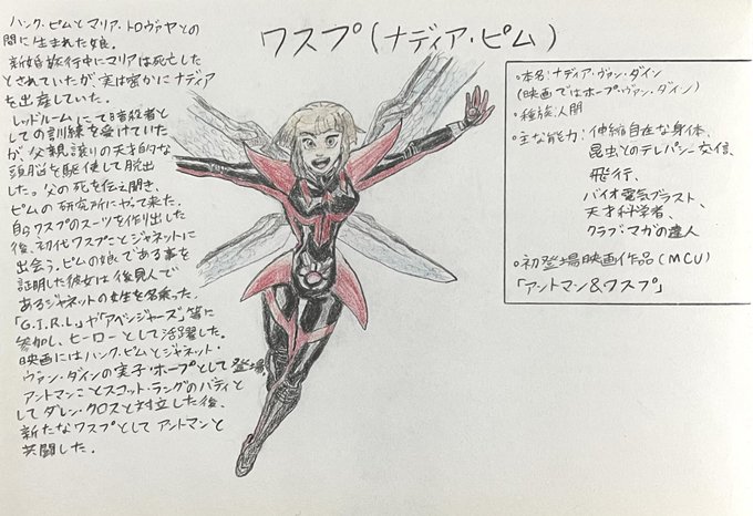 手描きMCUヒーロー列伝ワスプ ・本名:ナディア・ヴァン・ダイン (ホープ・ヴァン・ダイン) ・種族:人間 ・能力:伸縮自在な身体、飛行、バイオ電気ブラスト、天才科学者 ・初登場映画作品(MCU) 『アントマン&ワスプ』 #marvel #芸術同盟 #絵描きさんと繋がりたい #みんなで楽しむTwitter展覧会 #Wasp