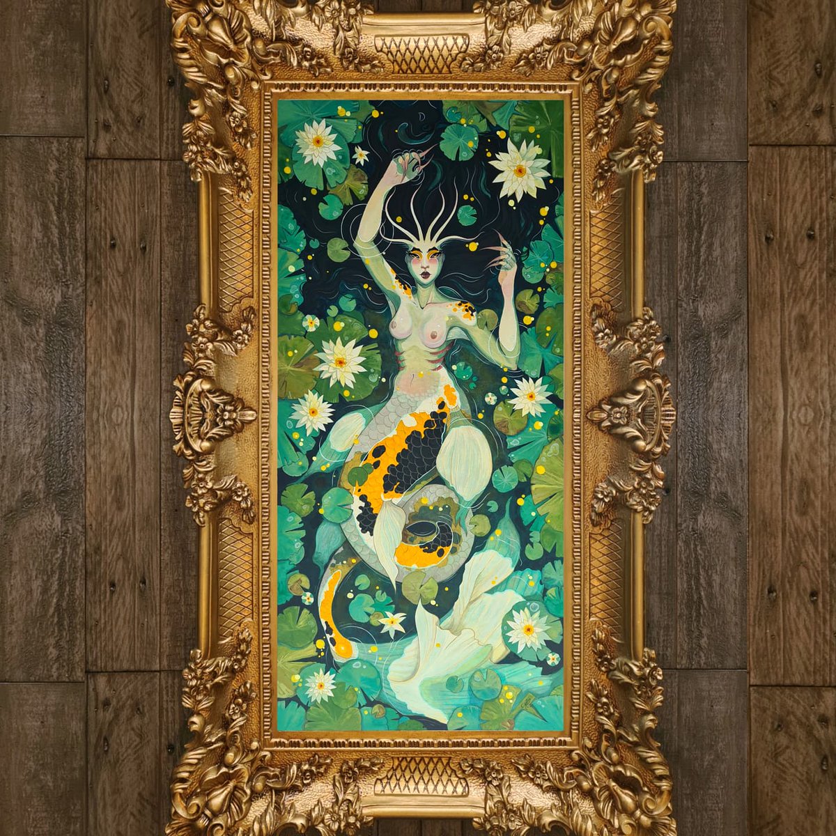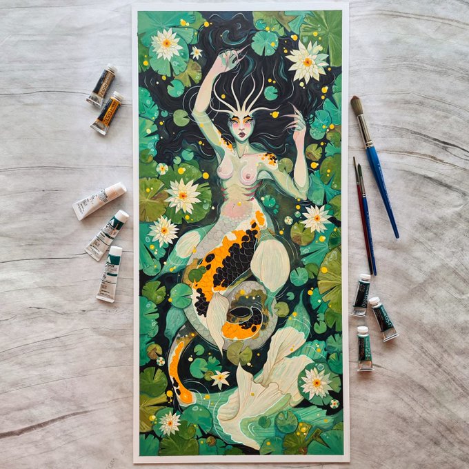 🧜♀️Waterlily🧜♀️ I am very happy and proud with how this piece turned out! Approximately 35 x 75 cm Watercolor, acryla gouache, regular gouache and pencil on Illustration board. #mermay #mermaid #waterlily #mixedmediapainting