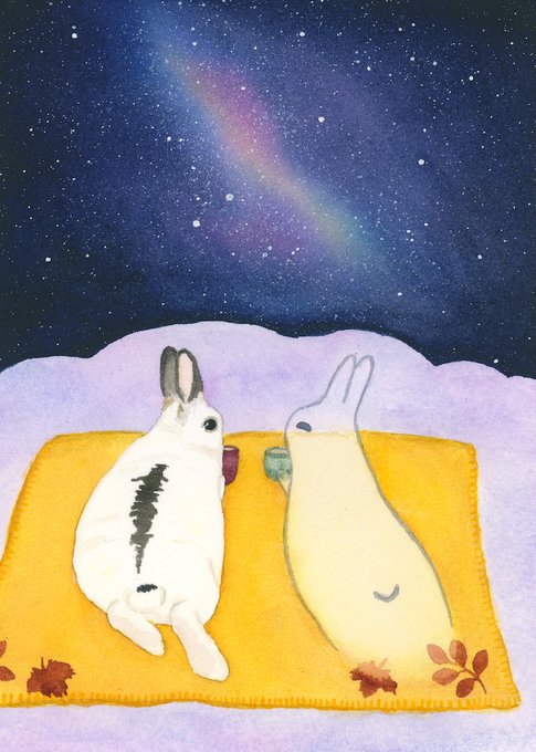 Chatting on a cloud under the stars. #watercolor #watercolorpainting #rabbit #bunny #透明水彩 #水彩画 #うさぎ
