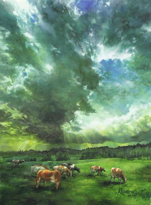"Under the Green Cloud", #watercolorpainting, 56x76cm, 2019 This might be one of my best works so far. Do you agree? Right now the original watercolor is exhibited in Wrocław (Poland) where it was announced best on the show! PRINTS: bit.ly/under-green-cl… #clouds