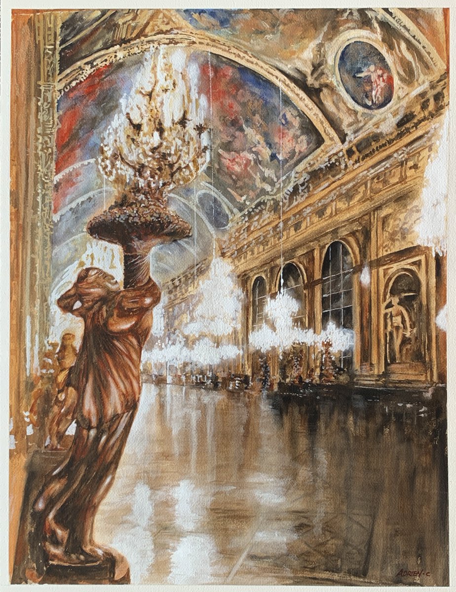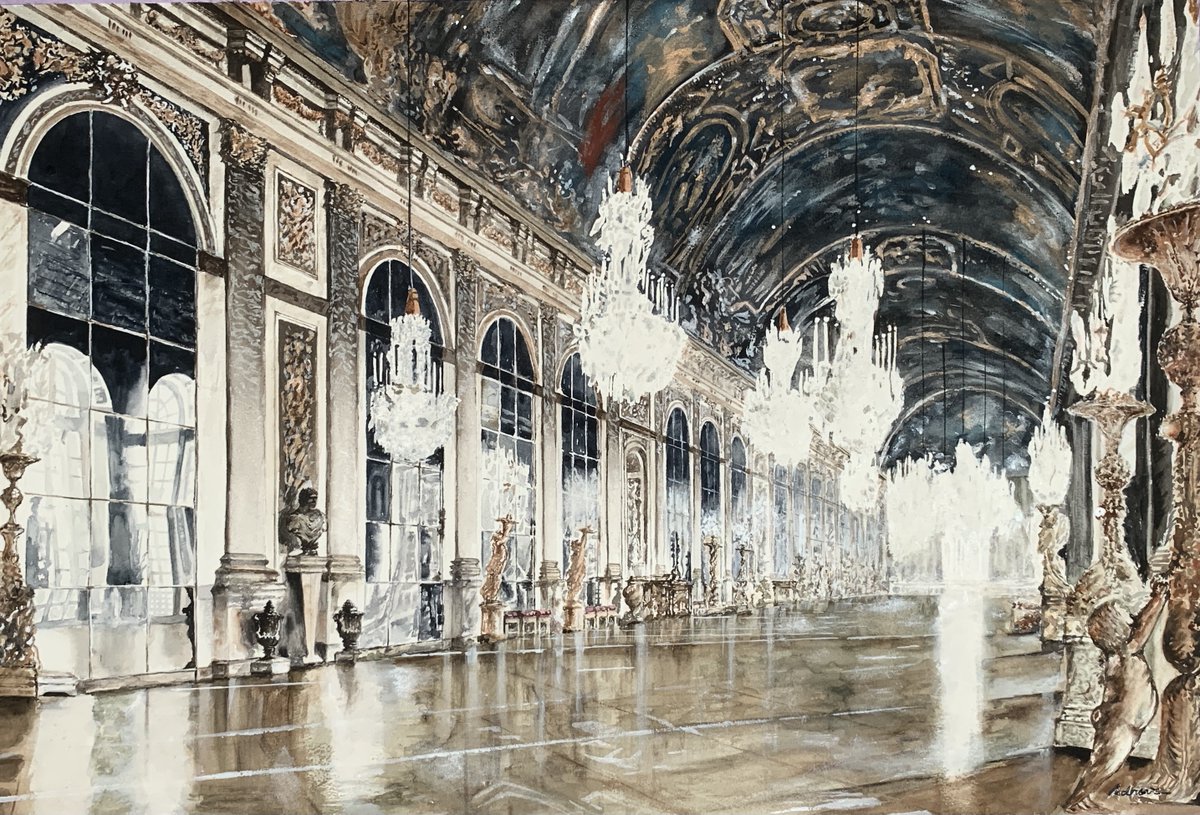 My husband Adrien's replication of "LA GALERIE DES GLACES À VERSAILLES PLONGÉE DANS LA LUMIÈRE DE CONTE DE FÉES" (original by Paul Dmoch), 46 x 61 cm, Aug 2021. #辰君草堂 #水彩 #Watercolors