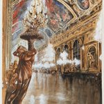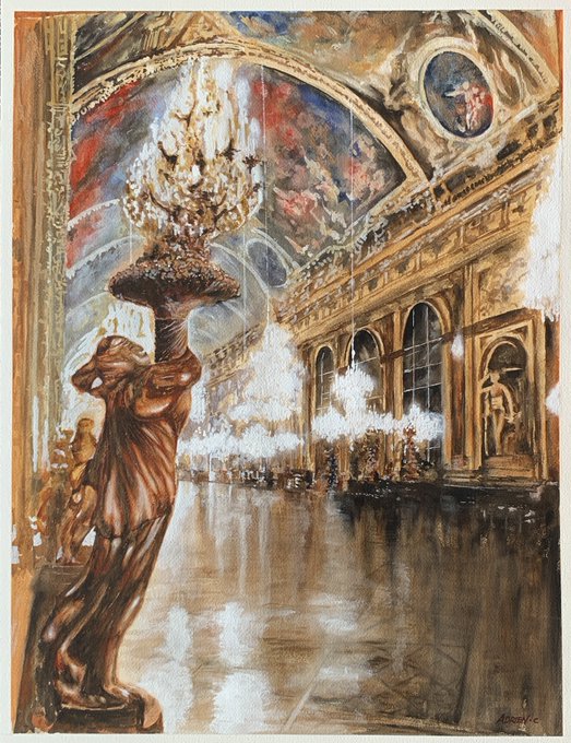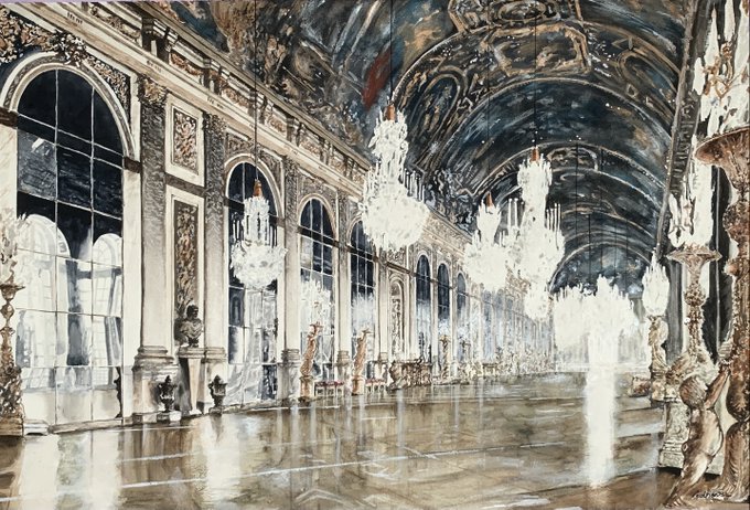 My husband Adrien's watercolors replication of "Galerie des Glaces, Versailles"(original by Paul Dmoch), 70 x 48 cm, Jun 2021. The "light" almost was the eternal theme of Paul Dmoch's watercolors, and it's fascinated. #辰君草堂 #水彩 #watercolors