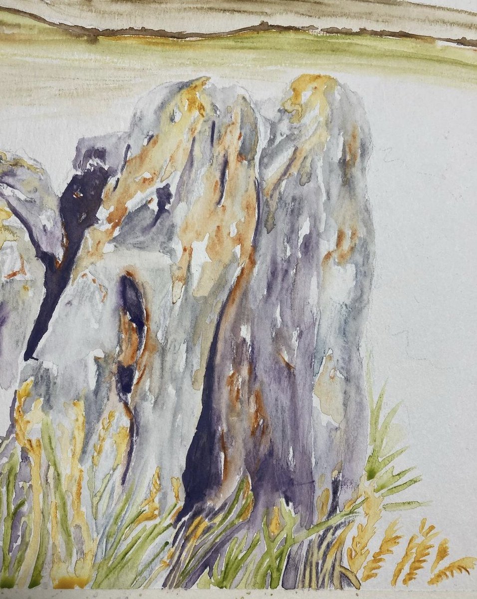 Five Wells Chambered Tomb. Started adding foliage. Head rough again, but dealing with it. Anger not so raw today. Hope all are well x #WIP #WorkInProgress #Landscape #WatercolourPencils #ArtistsOnTwitter #Derbyshire