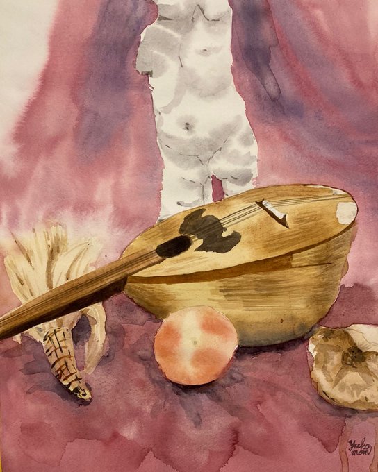 今日の水彩画練習😊 「静物、マンドリン」 初めてパルプ紙(F6)で描いた。 wet in wetがのらないんだよね~💦 あまり好きなお題ではなく… 全部人工物なんだよね~🤣 #watercolor #水彩画 #watson