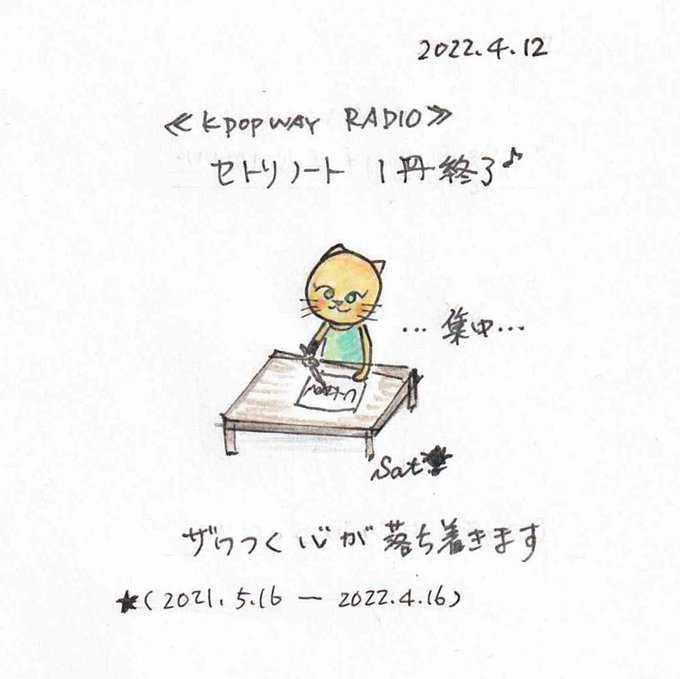 Kpopway RADIO セトリノート1冊目終了♪ ザワつく心が落ち着きます^^ #We_still_stay_here #WeareU #윤호야_찐친_어디_안가고_여기있다 #イラスト #落書き #お絵描き #アナログ絵 お箸やハサミは利き手変更出来たが、ペンだけは上手くいかず 乱筆失礼します。でも楽しい😺 twitter.com/satnyan_co/sta…