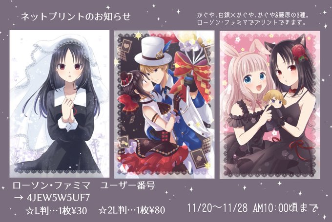 ネットプリントのお知らせです。過去絵の白かぐ、サークルカット全体絵のかぐや様、かぐや様&藤原ちゃんの3種あります。ローソン・ファミマでプリントできますので、よろしければどうぞ〜! #Web奉心祭同人版_02 twitter.com/Su0227/status/…