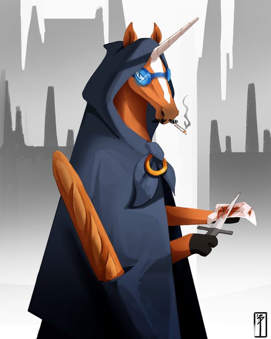 weretober 29/31 unicorn sometimes i just wanna be a unicorn assassin with blue swim goggles, mustache, cigarette, and a baguette #weretober2021 #weretober #illustration #characterdesign #anthro #unicorn #イラスト #創作 #キャラデザ