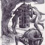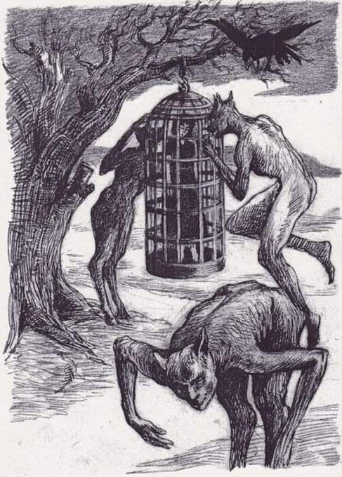 'La Corriveau in his Cage surrounded by werewolves' drawings by Philippe Poirier for :La Corriveau 'in Charles Le Blanc, Tales and Legends of Quebec. #philippepoirier #lacorriveau #charlesleblanc #werewolves #drawing #illustration