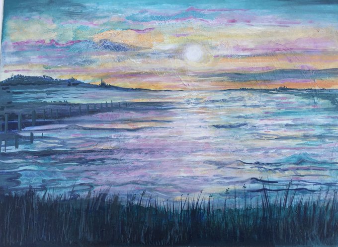 "Calming Colours" I went for a walk to the coast & brought back the calm into my home so I could paint - lets hope for peace & calm again in the world #painting #seascape #whitstable #kentcoast #artist #art #artwork #sunlight #sunset #ArtistOnTwitter