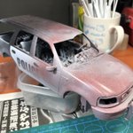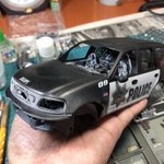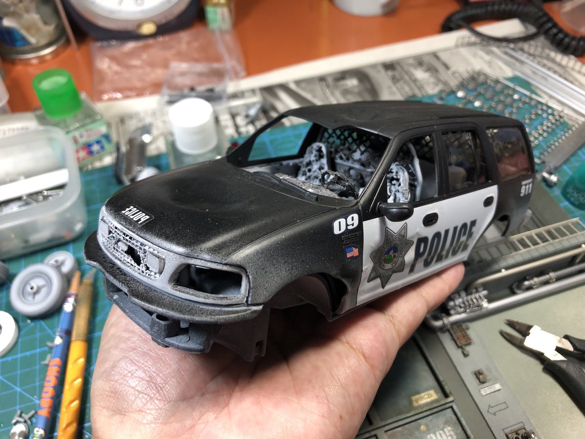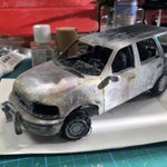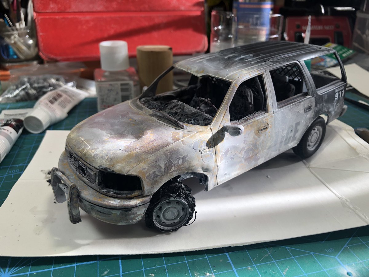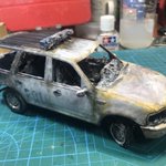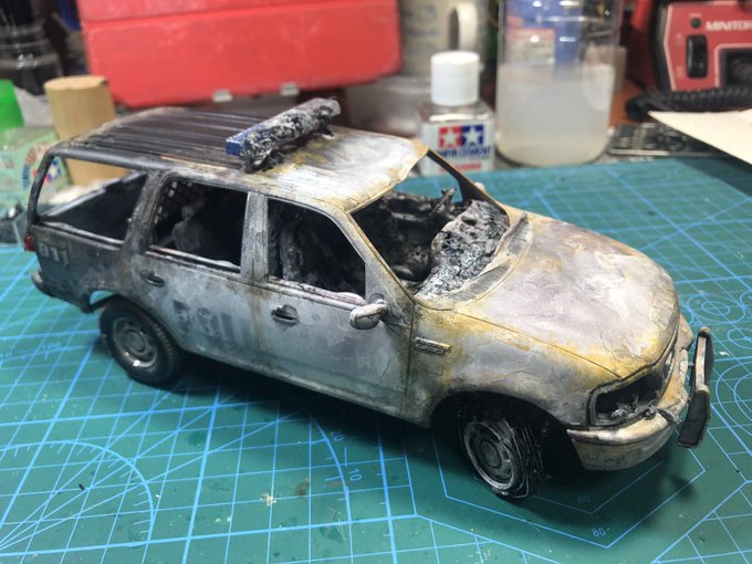 #WildRiverゾンビワールド ゾンビと言えば、焼け焦げ白亜のポリスカー 一旦、オキサイドレッド、ホワイトサフをランダム吹きし、 アクリルガッシュの黒を筆塗りし、更にその上から、イエローとホワイトを塗り重ねる。 独特のマット感のアクリルガッシュの絵の具は基本色だけでも色々役立つ。
