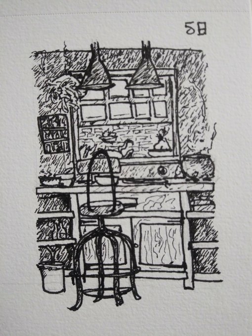 Day 5 of #WitchyCafeScribbles ! I got frustrated as I don’t normally draw interiors so I took a picture of my own kitchen and outlined the basic shapes of the counter/cabinets, everything else is drawn from scratch, I do like how this turned out though! (Kitchen) #inktober2021