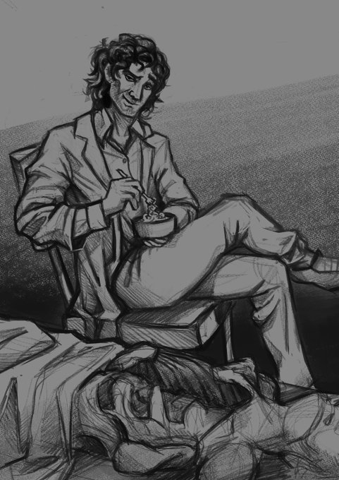 Day 21 Special Diet. Marshall Morzak, medical examiner. Tremere ghoul. He's not on a diet, he just loves noodles. #vamptober #monthofdarknesss #inktober #wod #vamily #vtm #vampirethemasquerade #worldofdarkness #WoD_ink2022 #ghoul #tremere