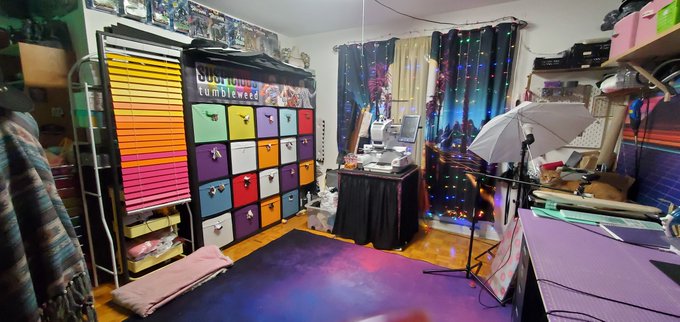 Did a bit of work on the workshop the past few days. I want everything to look nice in the background for YT and Twitch. Also helps me feel less cluttered even if it was organized. Table curtain, blinds and a clean cubby unit. #workshop #cosplay #synthwave #retrowave #vaporwave