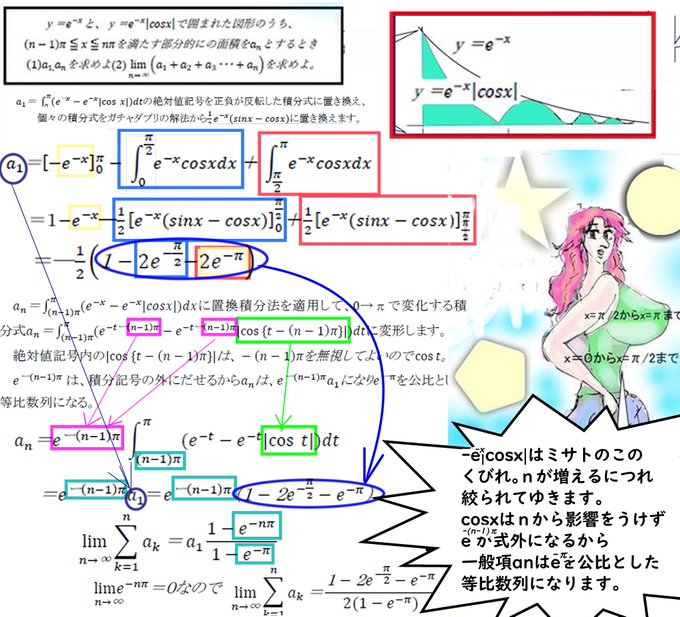 #芸術同盟 #みんなで楽しむTwitter展覧会 #illusRT #ArtistOnTwitter #WorldA_RT #早稲田大 #早大 #oc #勉強垢 #数3 #部分積分 早大の過去問を解説。-e^(-x) |cosx|はnが増えるにつれ狭くなる単調減少。cosxはnから影響をうけずe^-(n-1)π を式外からanはe^-πを公比とした等比数列になります。 twitter.com/deadlinear2011…