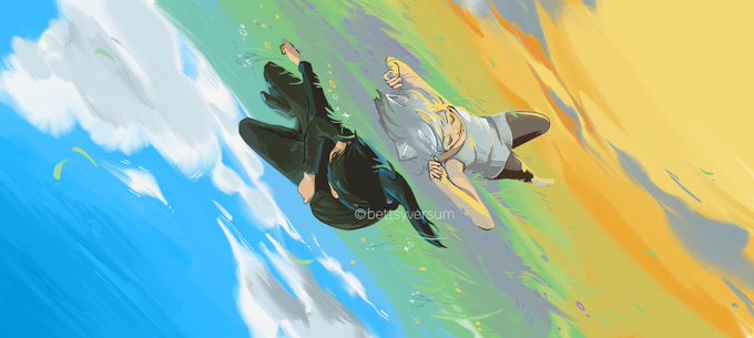 I painted directly on a beautiful neon red cover of an orchestra program booklet. The color is wonderful, I wanted to upcycle it. And it is Sunflower Season, I wanted draw Taion and Eunie with them. #Xenoblade3 #XenobladeChronicle3