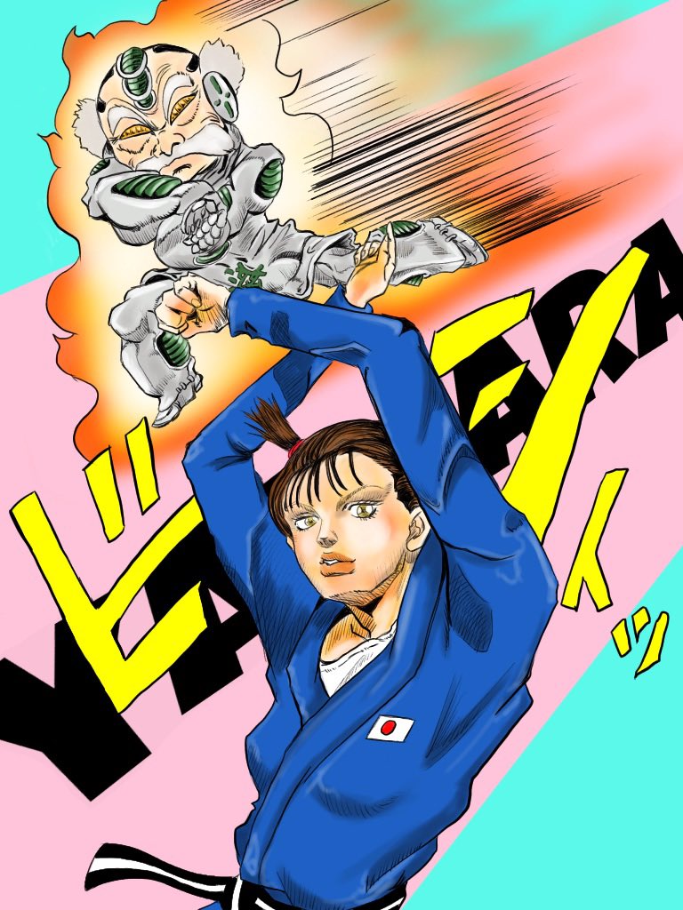『YAWARAの奇妙な一本背負い』 BGM 『雨にキッスの花束を』 今井美樹 もしくは 『いつもそこに君がいた』 LAZY LOU’s BOOGIE #yawara #柔 #柔道 #ジョジョの奇妙な冒険 #イラスト #Twitter交流会会場