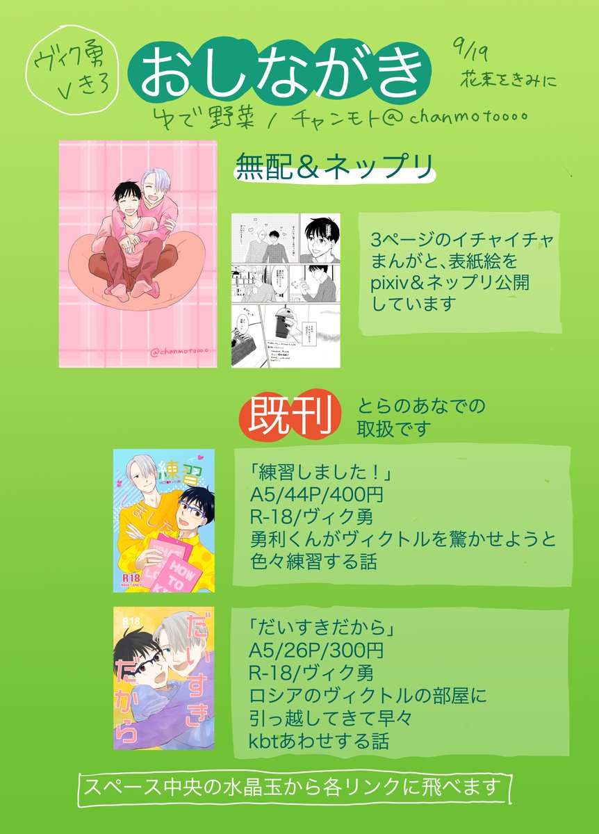 9/19 花束をきみに お品書きです。#YOIピクスク花束 過去絵のネップリも行う予定でしたが、作業が間に合わなかったので、近いうちに別途やりたいと思います😂 ※記載誤りがあったので差し替えました🙇♀️