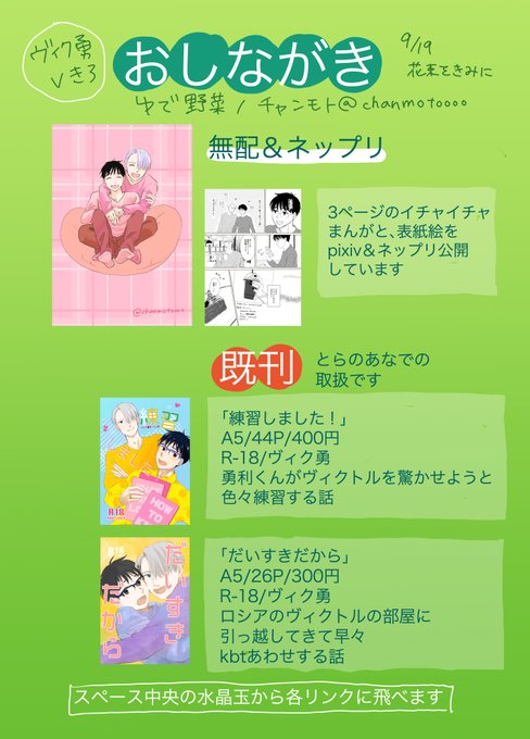 #YOIピクスク花束 今日のイベントのお品書きです(ギリギリ) 短い無配漫画二つあります。 あと以前公開していたものですが、9月いっぱいまでのWEB再録などもあります。 気軽に覗きにきてくださいませ~😊 よろしくお願いいたします!🌈