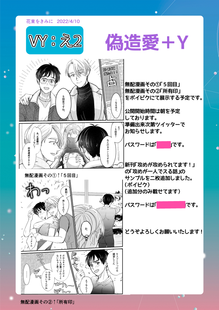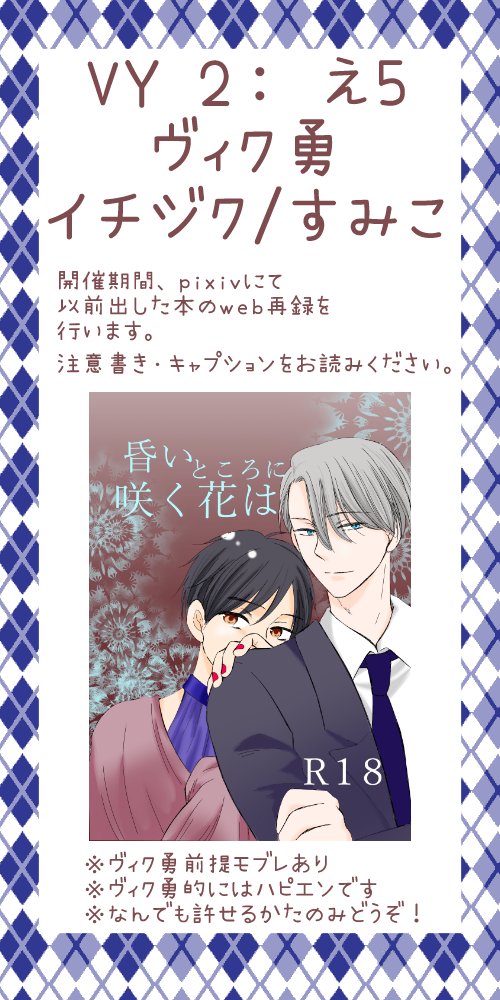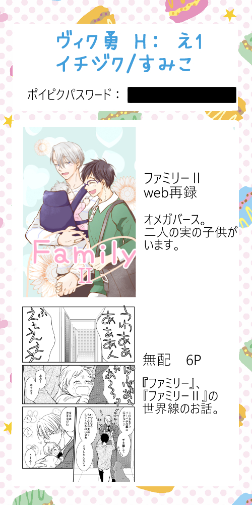 ヴィク勇•H: え1 にて参加させて頂きます。 ファミリーⅡのweb再録、同じ世界線の無配漫画6Pをポイピクにて上げる予定です。 パスワードは開始時刻にお品書きにアップします。 よろしくお願いします! #YOIピクスク花束