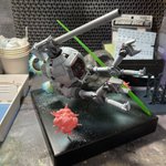 @jun_area51 今日はお声掛けいただきありがとうございました! 今回の作品もやはり画角がビタっと決まって気持ち良く撮影させていただきましたw イラスト風塗装、特に抜きかけたビームサーベルの照り返しが最高に決まってました! #YS100ガンプラコン #ガンプラ