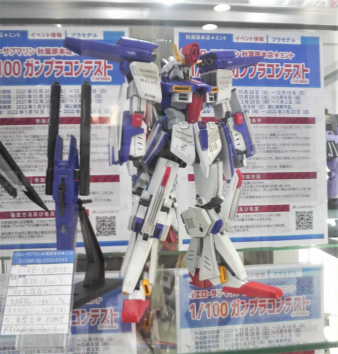 ご報告 現在、秋葉原イエローサブマリンさんで開催中の #YS100ガンプラコン にZZ-Re(強化型)で参加しました! 背景のコンペ告知用紙がトリコロールでシナジー効果😆 皆様、お立ち寄りの際はご覧頂けましたら幸いです。 で、気に入って頂けましたら一票ご投票して頂けましら嬉しいです 😂