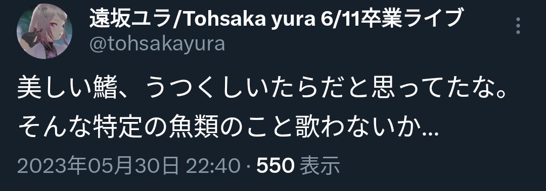 【歌枠-singing stream-】歌う【遠坂ユラ/Vtuber】 youtube.com/live/LkCgSn7uo… #yura_art #Yura_T ユラちゃんの歌狂愛です(マテ (りゃっ とか 。のかわりに o とかは マジで見たことな(りゃっ (マテ のコメント見たときのユラちゃんは稀に見る爆笑ぶりだと思いましたo