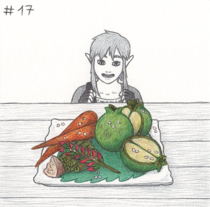 #Inktober2022, Day 17: #Salty. How about some Salt-Grilled Greens? #inktober #TheLegendOfZelda #BreathOfTheWild #ZeldaBreathOfTheWild #TheLegendOfZeldaBreathOfTheWild #Zelda #BotW #ZeldaBotW #Link #SaltGrilledGreens #Nintendo #food #art #fanart #traditionalart