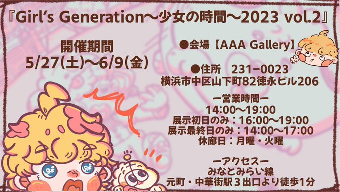 🎨おしらせ🎨 横浜 AAA GALLERYさんにて 『Girl’s Generation ~少女の時間~2023 vol.2』の 展覧会に参加させていただきます! 🔴開催期間 5/27(土)〜6/9(金) 前回とはまた違ったテーマなので ぜひみなさんおたのしみに! お越しおまちしておりますー! #aaagallery #イラスト #創作
