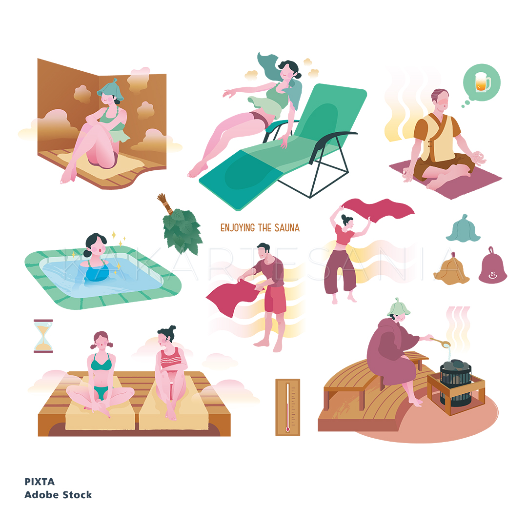 サウナ活動を楽しむ人々のセット creator.pixta.jp/illustration/1… 友達にアウトドア関係の感触が良いなら サウナイラストはどう?と助言をもらったので それだ!と制作したもの #ストックイラスト #PIXTA #adobestock