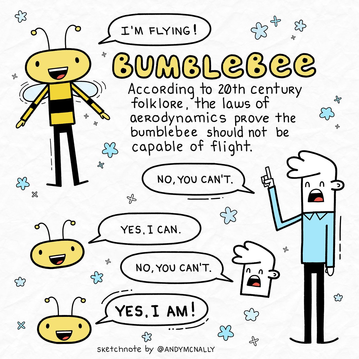 Flight of the Bumblebee sketchnote. Bumblebees believe in themselves. Fly bumblebees, fly! #sketchnotes #illustration #conceptsapp #bumblebee #flightofthebumblebee #folklore #aerodynamics