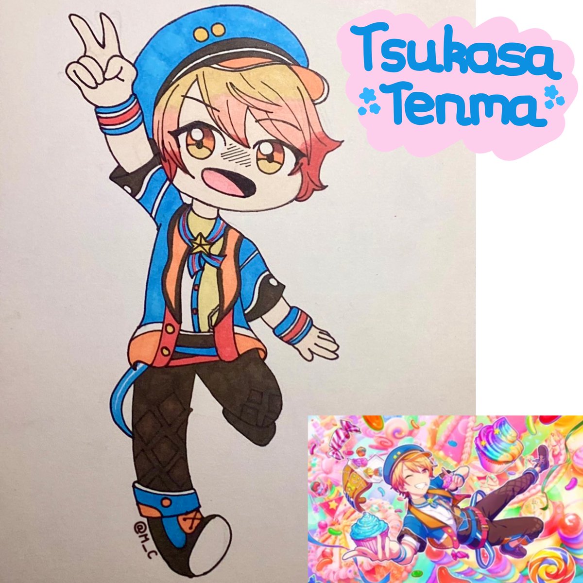 Chibi-style drawing of Tsukasa in his Pop in my Heart costume! Eeeee I can’t wait for this event to come to en Sekai 💙🧡✨ #prsk_FA #projectsekai #Fanarts #candy #chibi #anime #manga #aesthetics #cute #art #ArtistOnTwitter #markers #traditionalart #proseka #tsukasa #tsukasatenma