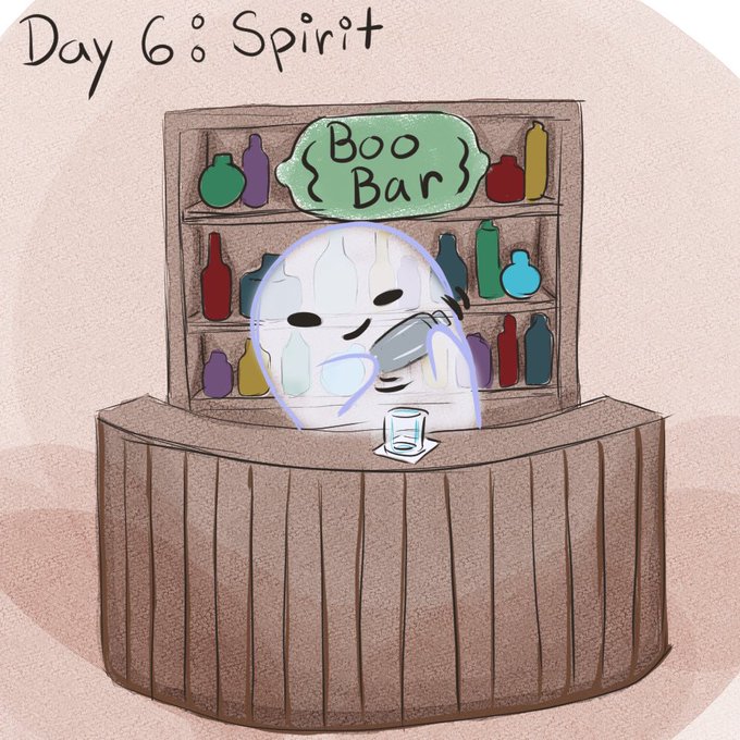 Wanted to make my first tweet with my fav inktober prompt so far! Image: ghost making cocktail in front of a bar called “Boo Bar” #inktober2021 #spirit #alcohol #inktoberday6 #CLIPSTUDIOPAINT #digitalart #illustration #ghost