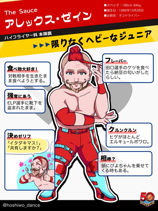 【すごくてへんな生き物】 アレックス・ゼイン選手(@AlexZayneSauce)の特徴をまとめてみました! ゼイン選手のサイン会に参加したくて早めに並んだら、目の前で整理券配布終了したことがあります。 #AlexZayne #njpw50th #njpw #njpwfanart