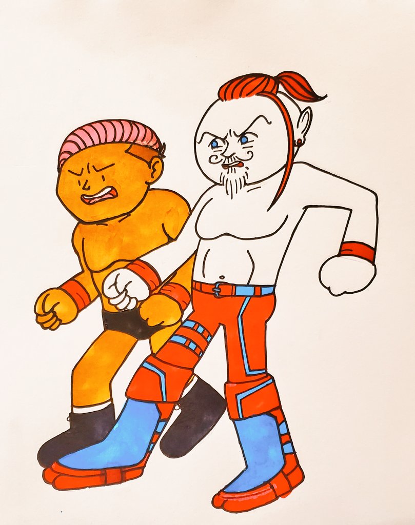 リンダマン選手とゼイン選手。 ちょっとだけ手塚治虫先生風に描いてみました。 塗りムラがあるのはアナログなので、そこはご愛敬で😁。 またこの二人のタッグが観られますように✨️。 #ElLindaman #エル・リンダマン #AlexZayne #GLEAT #njpw #njSJTL #njpwfanart