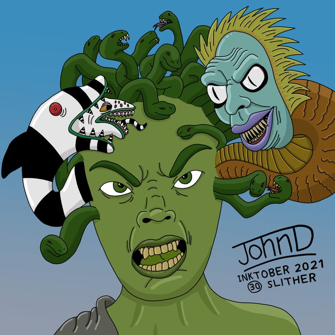 #inktober2021 - 30- Slither #slither #medusa #greekmythology #mythology #myths #beetlejuice #betelgeuse #snakes #serpents #sandworm #halloween #ancientgreece #timburton #michaelkeaton #theghostwiththemost @MichaelKeaton @BeetlejuiceBway #spooky #halloweenart @inktober #inktober