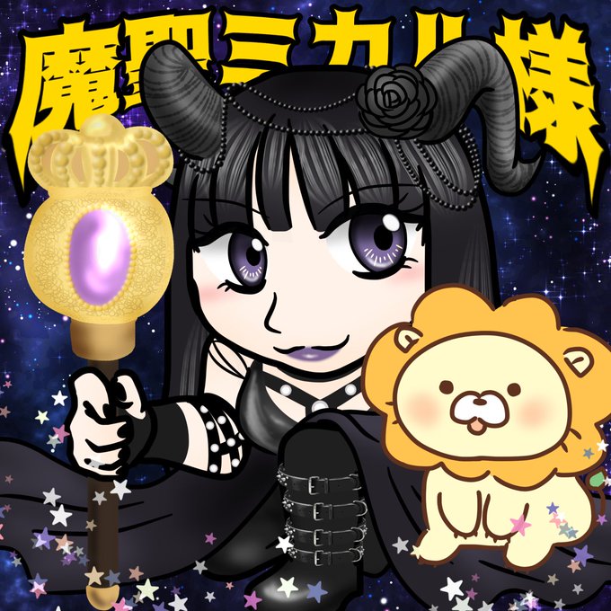 ついに完成しました‼️🥹 #ANCIENTMYTH 、Vo. ミカル様 @michal666jp の御生誕お祝いイラストです❣️😈🦁🎂🍾🎁🎉 でもなんか、私が描くと魔族感薄いような😭笑 けっこう細かく描いてるようで、誤魔化してるところもあります🤣 しもべの🦁ちゃんにも出演してもらいました♡(著作権ダイジョブ!?)