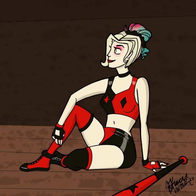 A more relaxed Harley. Anyone else wonder what split color hairdye looks like in a bun? After drawing this I'm really, really curious. . . . #harleyquinn #dcharleyquinn #harleyquinnfanart #dccomics #dcgirls #fanart #girlboss #artpractice #animationstudent #angrymuffinstudio