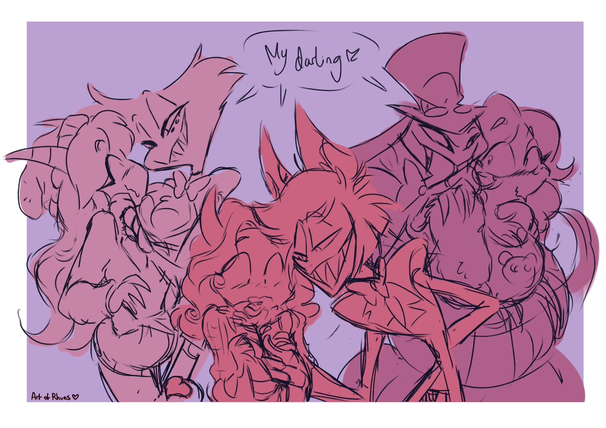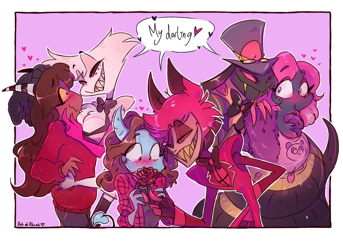 A little gift requested by @panderp_123 for the @dork_studios gang of their sonas being flustered by the bois as a thank you for all their hard work over the last few months ❤️ #AnthonyandBeast #HazbinHotelFanart #HelluvaBossFanart #artofrhues