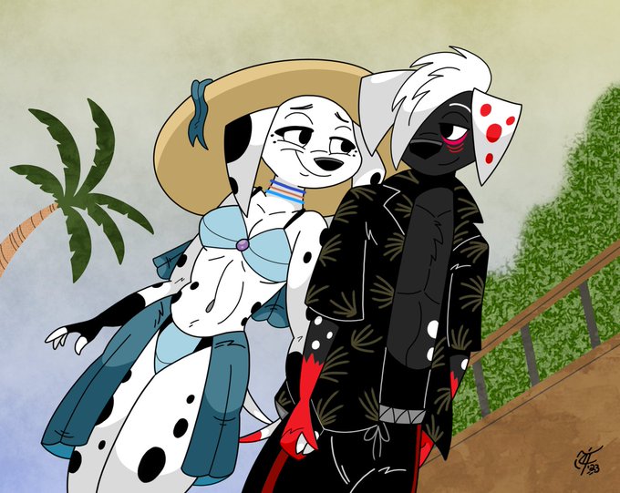 A 101DS-related commission for @Demon2000Dark featuring Dolly and Demon enjoying a boardwalk stroll together 🐾🏖💗🌞 #101DalmatianStreet #Dolly #Demon #beachside #beachwear #boardwalk #anthrofurry #fanart #ocart #commissionart