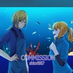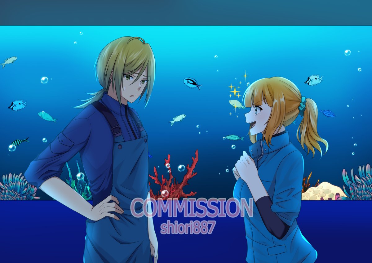 Commission for mindsebbandflow at deviantart Characters Kuuya from aquatope of white sand and Emmy(OC) of mindsebbandflow #aquarium #digitalart #aquatope_anime #kuuya #fanart