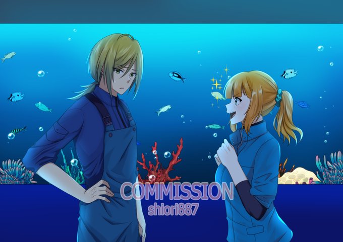 Commission for mindsebbandflow at deviantart Characters Kuuya from aquatope of white sand and Emmy(OC) of mindsebbandflow #aquarium #digitalart #aquatope_anime #kuuya #Fanart