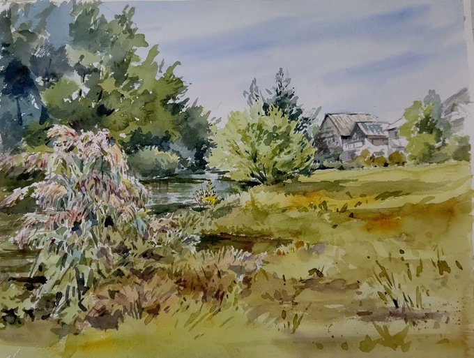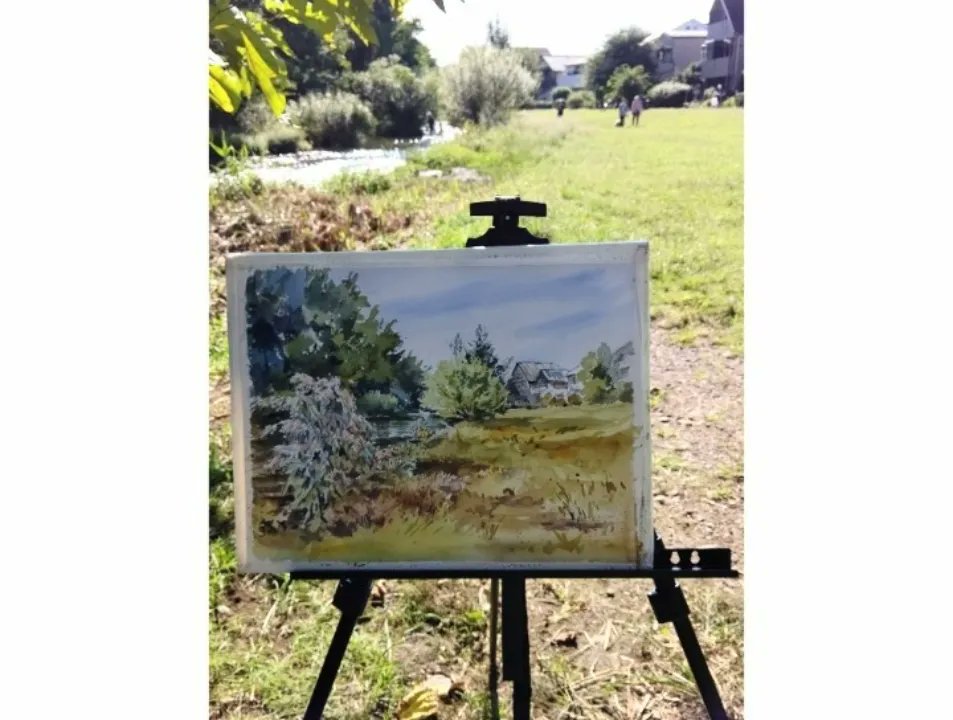 川のそばで爽やかな空気を感じながらの先日の教室スケッチです。 #野外スケッチ #スケッチ #透明水彩画 #水彩画 #写生 #落合川 #風景画 #watercolour #watercolor #landscapepainting #outdoorsketching #outdoorpainting #ochiairiver #aqurelle